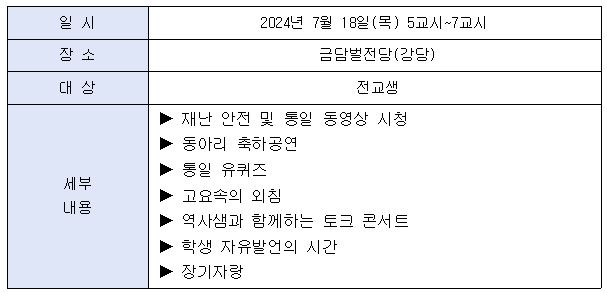 학부모님께! 자녀의 교육에 헌신하며 항상 본교 교육활동에 관심을 가져주시는 학부모님께 감사드립니다. 1학기 말 교육활동의 일환으로 민주평화통일자문회의 경남 창원시협의회에서 주관하는 2024.찾아가는 통일 퀴즈 원정대가 본교를 방문하여 행사를 진행하게 되었습니다. 학생들이 참여하여 장기자랑 및 통일 퀴즈 맞추기 등 다양한 활동을 진행하고 활동한 내용 은 영상물로 제작하며, 제작된 영상을 추후 학부모님께 안내드리도록 하겠습니다. 행사 일시 및 내용은 아래표를 참고하십시오.