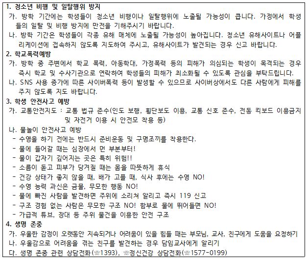 가정에서의 생활교육이 그 어느 때보다 중요한 시기인 만큼 바쁘시더라도 사랑스러운 자녀가 안전하고 행복한 방학 생활을 할 수 있도록 많은 관심과