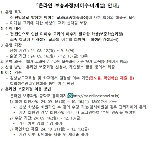 전·편입으로 인해 발생한 미이수 교과에 대한 학습(보충학습과정)과 우리 학교에서 개설되지 않은 선택 교과(미개설과정)를 온라인으로 학습할 수 있는 “온라인 보충과정”을 다음과 같이 안내합니다. 온라인 보충과정 수강을 희망하는 학생은 신청서를 9월 2일(월요일)까지 담임 선생님에게 제출해주시기 바랍니다.(미희망시 제출 생략)