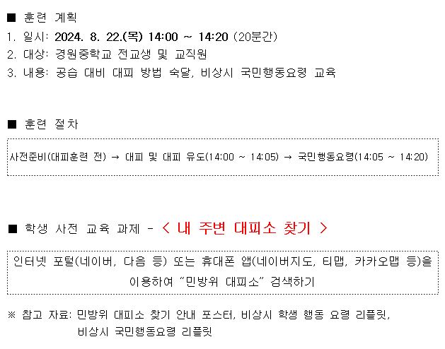이번 민방위 훈련은 공습 상황에 대비한 대피방법 숙달 및 국민행동요령 교육 등을 통해 비상시 국민·학생 안전을 보장하기 위함입니다.