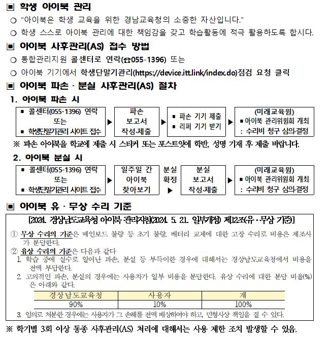 경상남도교육청은 개별 맞춤형 미래교육 및 학생 디지털 리터러시 신장을 지원하고자 아이북을 보급·관리하고 있습니다. 학생들의 아이북 활용 교육활동을 위해 아이북 관리 및 사후관리(AS) 절차, 유·무상 수리 기준에 대해 다음과 같이 안내드립니다.