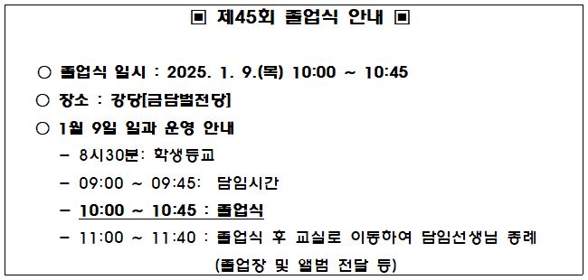 희망찬 을사년(乙巳年) 새해를 맞이하여 가정에 평안함이 가득하시기를 기원합니다. 가정에서 정성과 사랑으로 자녀교육에 관심을 가져주신 덕분에 어느덧 3년이라는 시간이 흘러 제45회 졸업식을 맞이하게 되었습니다. 새로운 꿈과 희망으로 본교에 입학한 것이 엊그제 같은데, 자랑스럽게 본교의 교육과정을 마치고 더 큰 세계를 향해 비상하는 학생들의 모습을 바라보니 감개무량하며 졸업생 모두가 이 나라에 필요한 훌륭한 인재로 성장해 주리라 기대합니다. 본교 졸업식을 맞이하여 학생들이 유종의 미를 거둘 수 있도록 협조하여 주시기 바라며, 자리에 참석하시어 졸업생들의 새로운 출발을 함께 축복해주시길 바랍니다.