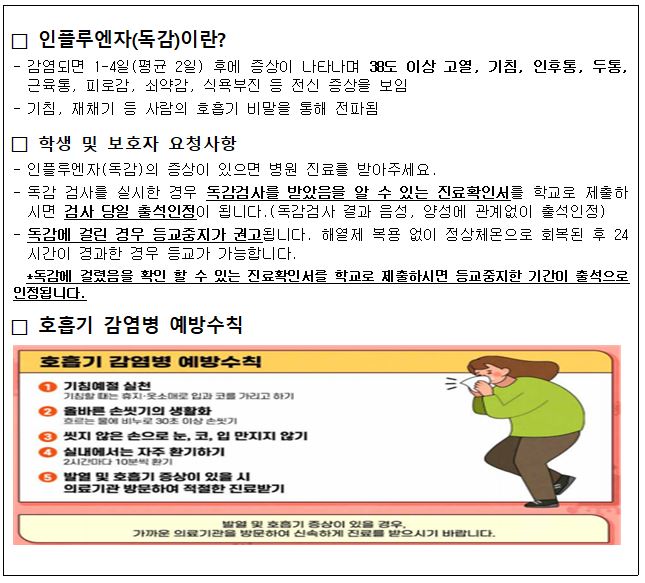 학부모님, 안녕하십니까? 가정에 건강과 행복을 기원합니다. 질병관리청은 인플루엔자(독감) 환자 수 증가에 따라 12월 20일 0시부터 전국에 인플루엔자 유행주의보를 발령했습니다. 현재 교내에도 인플루엔자 확진자 발생이 증가하고 있습니다. 인플루엔자 의심 증상인 38.0도 이상의 열, 기침, 인후통, 근육통, 피로감, 쇠약감, 식욕부진 등 전신 증상이 있다면 신속히 의료기관을 방문하여 검사 및 치료가 진행될 수 있도록 해주시길 부탁드립니다. 한 교실에서 여러 명이 단체생활을 하는 학교의 특성상 감염병 전파가 쉽게 이루어질 수 있으니, 인플루엔자 및 감염병 예방을 위해 독감 예방 접종하기, 올바른 손씻기, 호흡기 증상시 마스크 착용하기 등 개인위생을 철저히 준수하여 건강한 학교생활을 이어갈 수 있도록 가정에서도 함께 지도해 주시길 부탁드립니다.